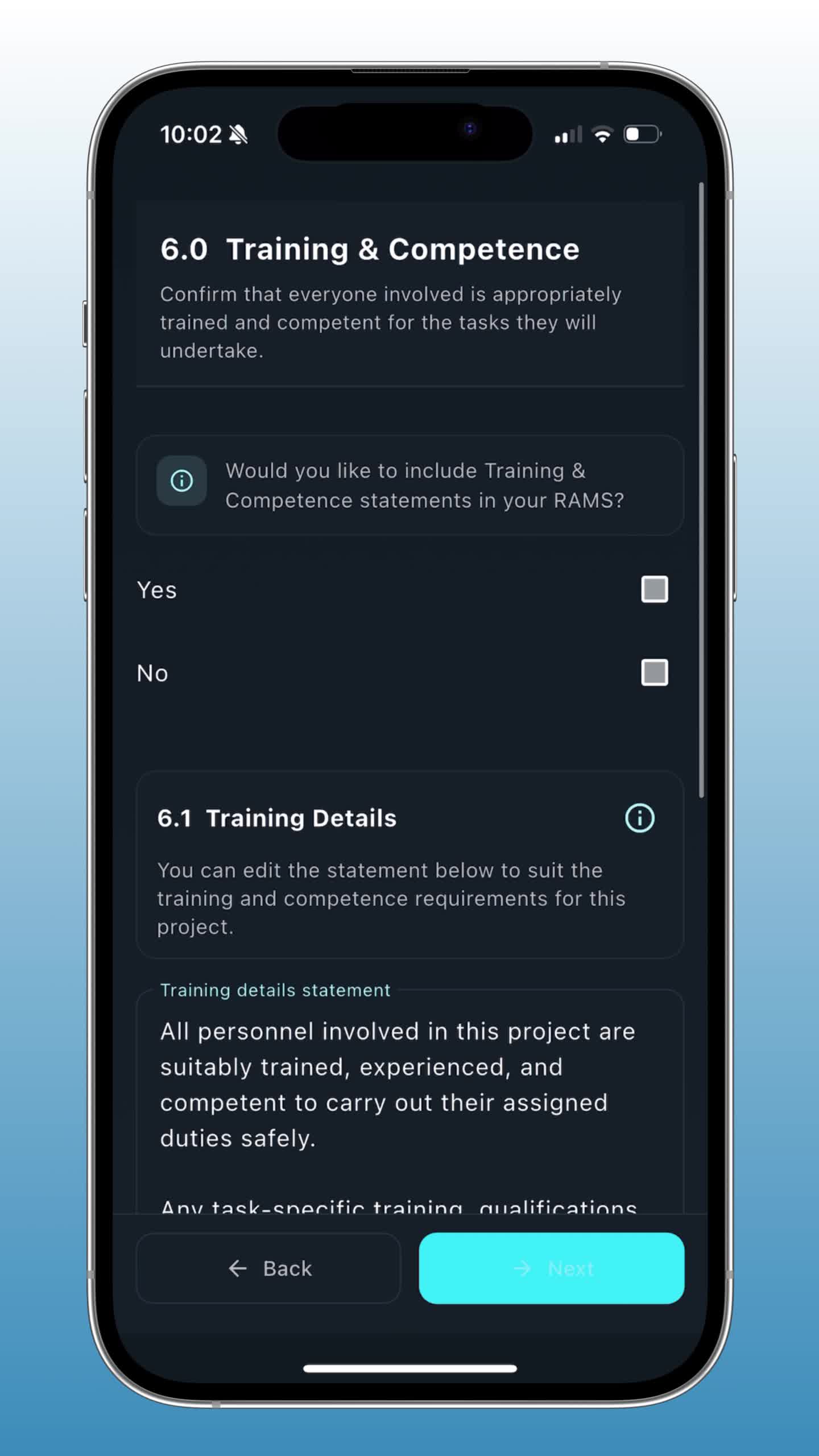 Generate fully compliant Risk Assessments and Method Statements on-site, in the van, or at home — no laptop needed.